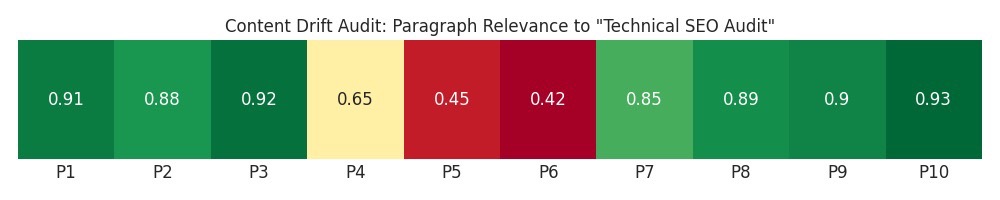 Figure 2 – Content drift audit: paragraph relevance to “Technical SEO Audit”. Green = on-topic, red = off-topic.