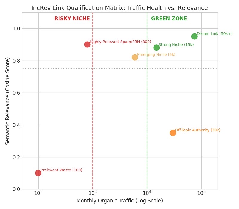 3. Score Backlinks with a Two-Factor Model (Link Audit): Combine Organic Traffic Health and Semantic Relevance to classify links as gold, niche gems, authority padding, or waste.