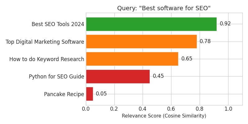 Figure 1 – Query: “Best software for SEO”. The model ranks pages by cosine similarity (semantic relevance).